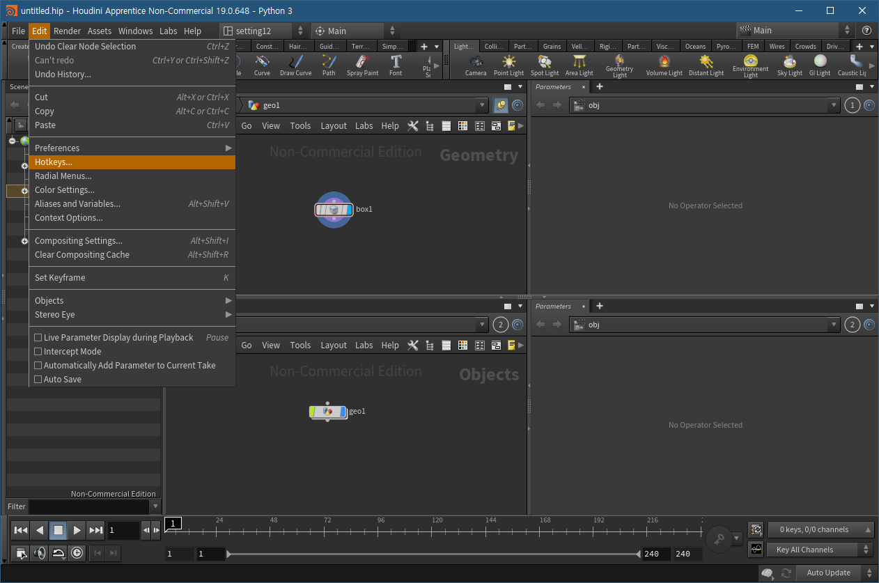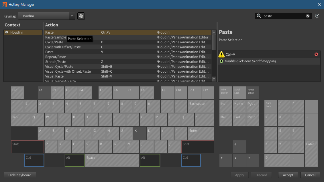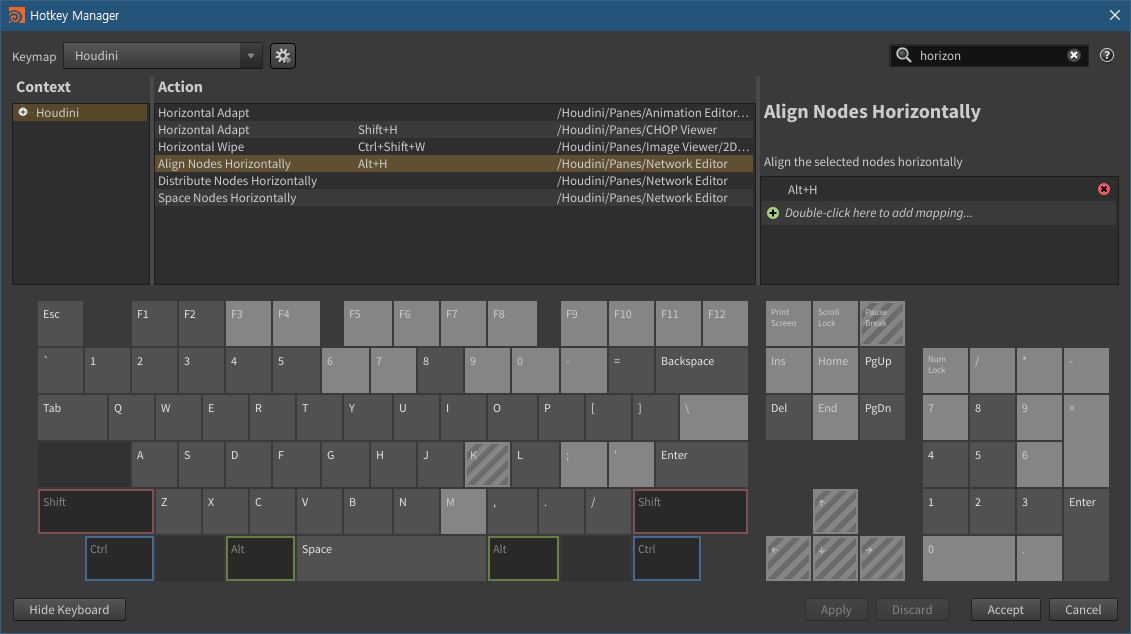 후디니를 연습하면서 몇 가지 필요를 느낀 단축키 설정이 있다.